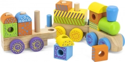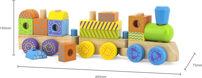 Ta kakovosten lesen vlakec sestavljajo vagoni z zatiči, na katere otroci zlagajo pisane geometrijske kocke. Združuje zlaganje, vleko in gradnjo, zato spodbuja domišljijo in uri koordinacijo oko–roka. skrbno obdelan les in nestrupene barve zagotavljajo varnost in vzdržljivost pri vsakodnevni igri.