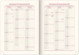 Tedenski dnevnik Diamante 2026 v elegantni rdeči barvi s površino, ki spominja na diamantni brus. Idealen za tisk z vtisom, vsebuje zaobljene robove, zanko za svinčnik in elastični trak, z razporedom v češko-slovenskem koledarju.