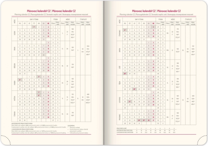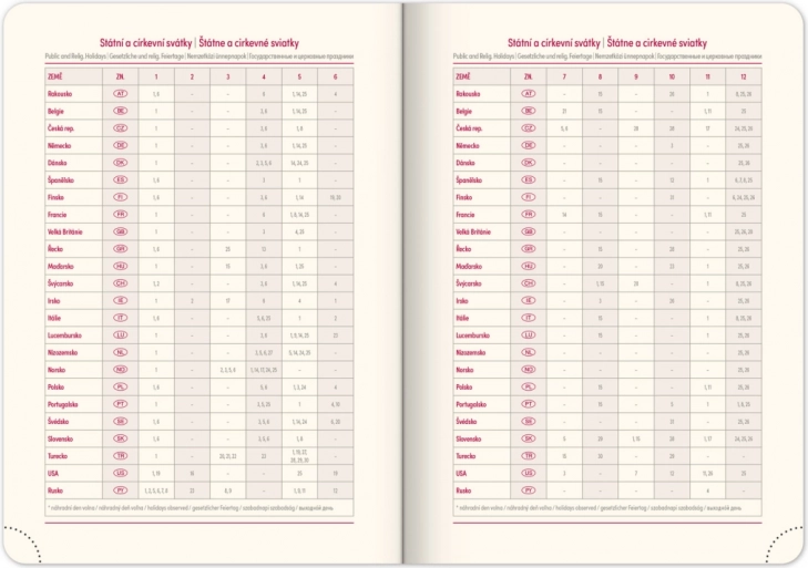 - Tedenski razpored s češko-slovaškim koledarjem in drugimi jeziki.