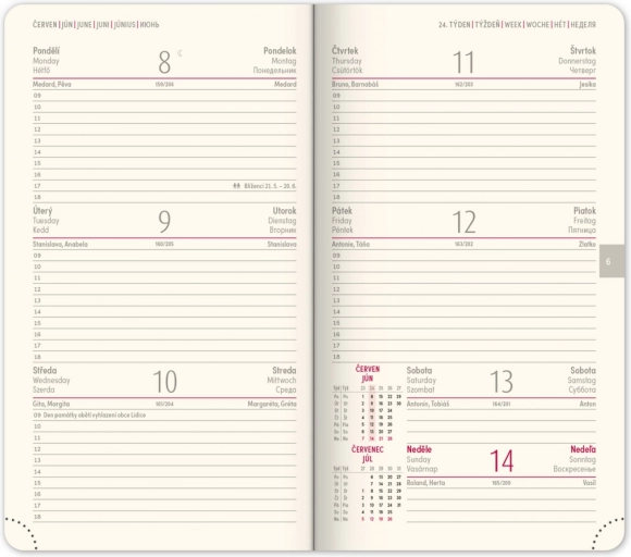 Koledarski del dnevnika pokriva širok nabor jezikov: češko-slovenski koledar, dopolnjen z angleščino, nemščino, madžarščino in ruščino. Vključuje tudi: