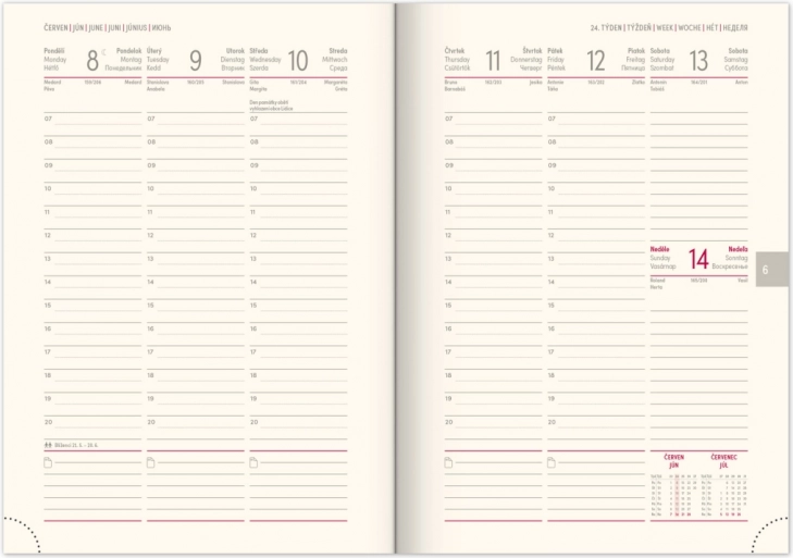 Dnevnik ni le praktičen, temveč je zaradi rdeče barve tudi stilski in opazen. Pripravljen je, da vam pomaga organizirati vaše naloge in pomembne sestanke v več jezikih – vključno z angleščino, nemščino, madžarščino in ruščino.