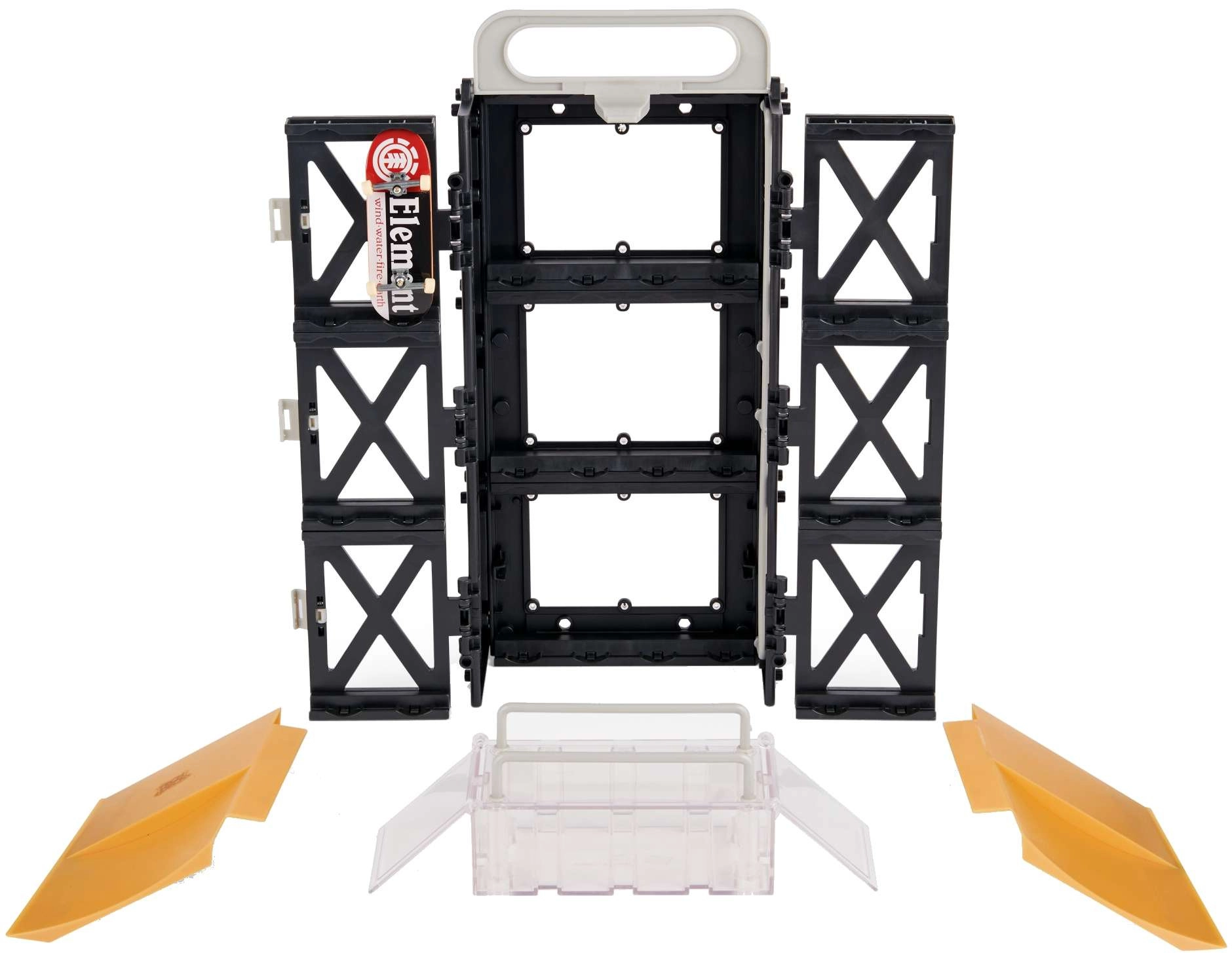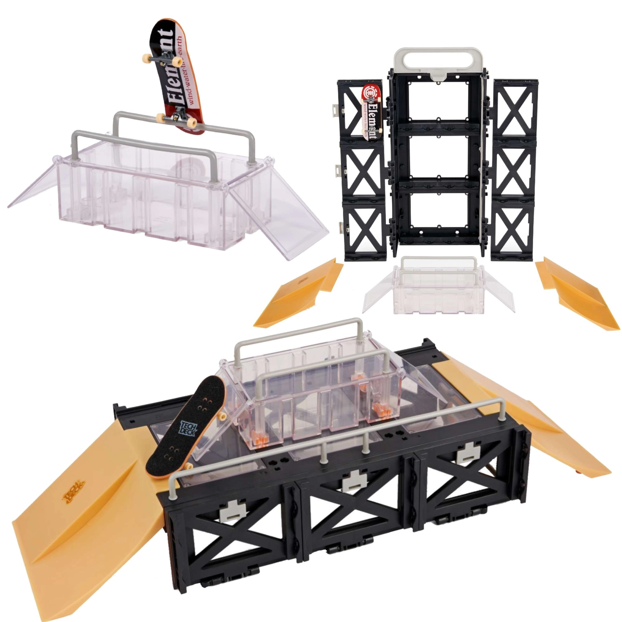 - 1× fingerboard Tech Deck ELEMENT, 1× kovček/stojalo, box z tečaji, 2× izskočni kicker, 4× vertikalni spoj, 1× desni kicker z dvojnim spustom, 1× levi kicker z dvojnim spustom, 2× visoka ograja, 1× dolga ograja, navodila