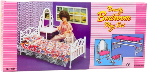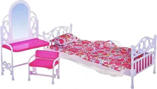 Komplet pohištva za punčke ponuja veliko možnosti za igro – otrok lahko položi punčke v posteljo, opravi jutranjo toaleto ali punčko pripravlja na ples. Igra s pohištvom razvija domišljijo, ustvarjalnost in ročne spretnosti ter uči otroka skrbeti za red in prostor. Pohištvo je lahko in izdelano iz trpežne in varne plastike. Primerno za večino punčk tipa Barbie in podobnih (pribl. 29 cm višine).