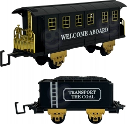 V kompletu sta dva podrobno izdelana vagona – tovorni za premog in potniški. Preprosto se spenjata in gladko vozita po tirih.