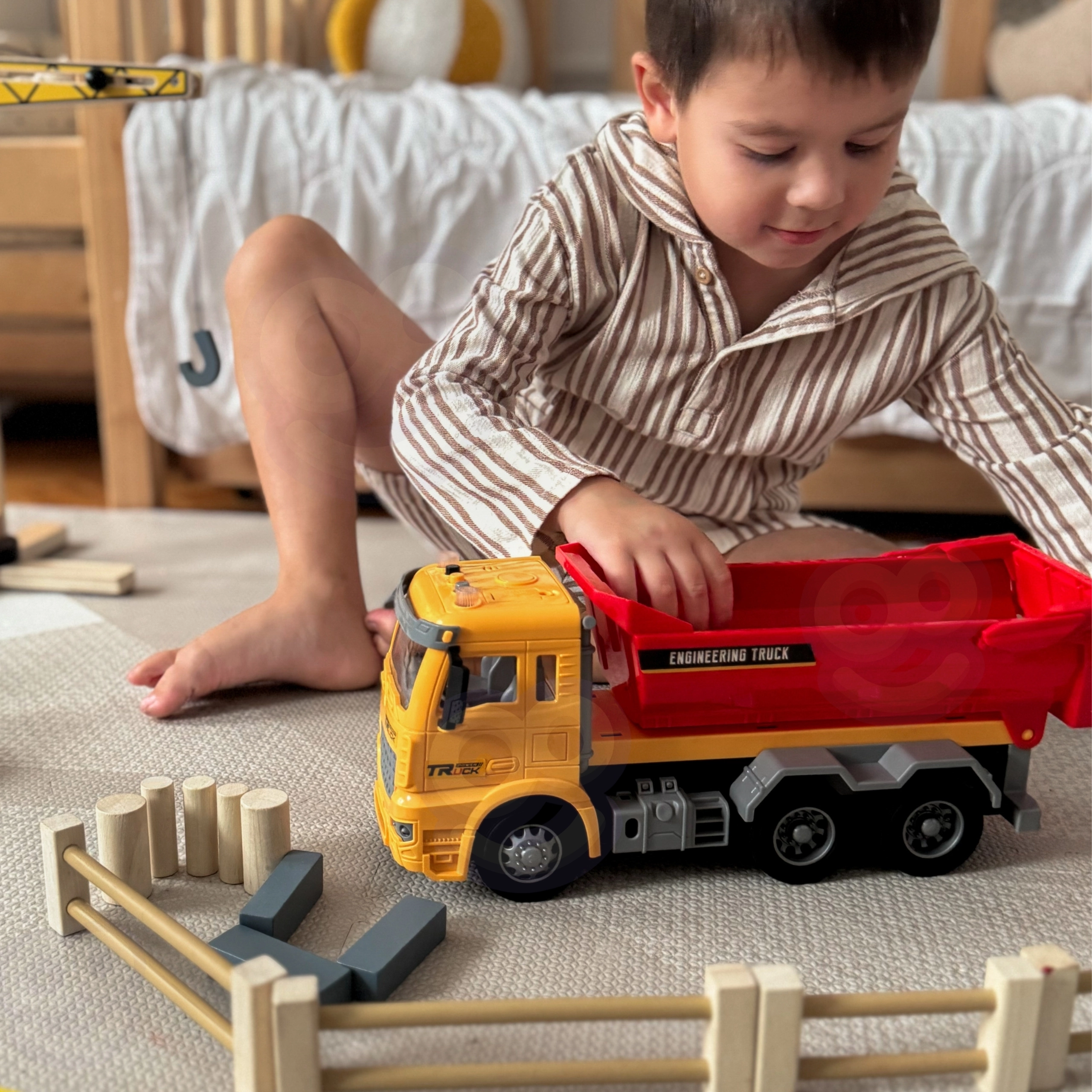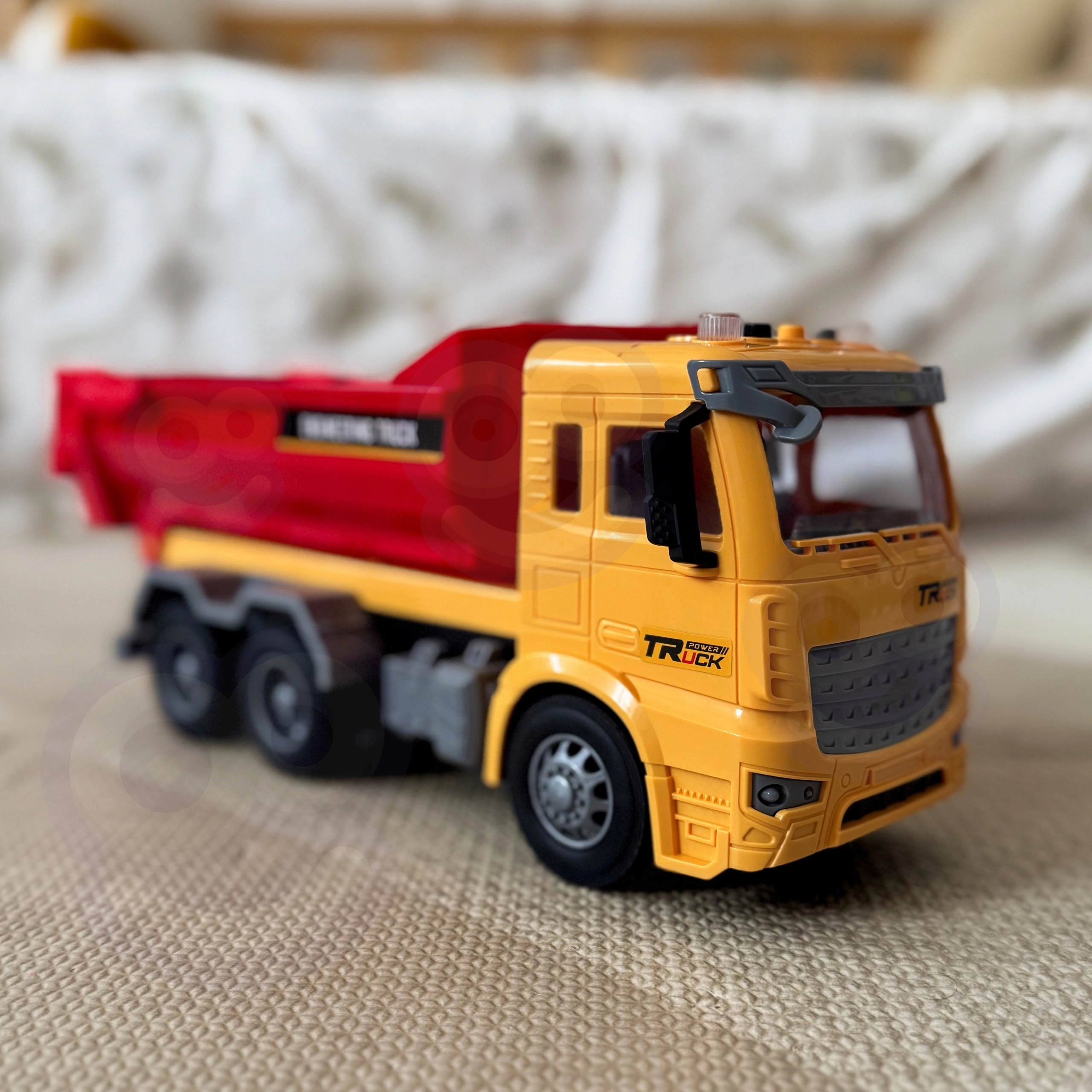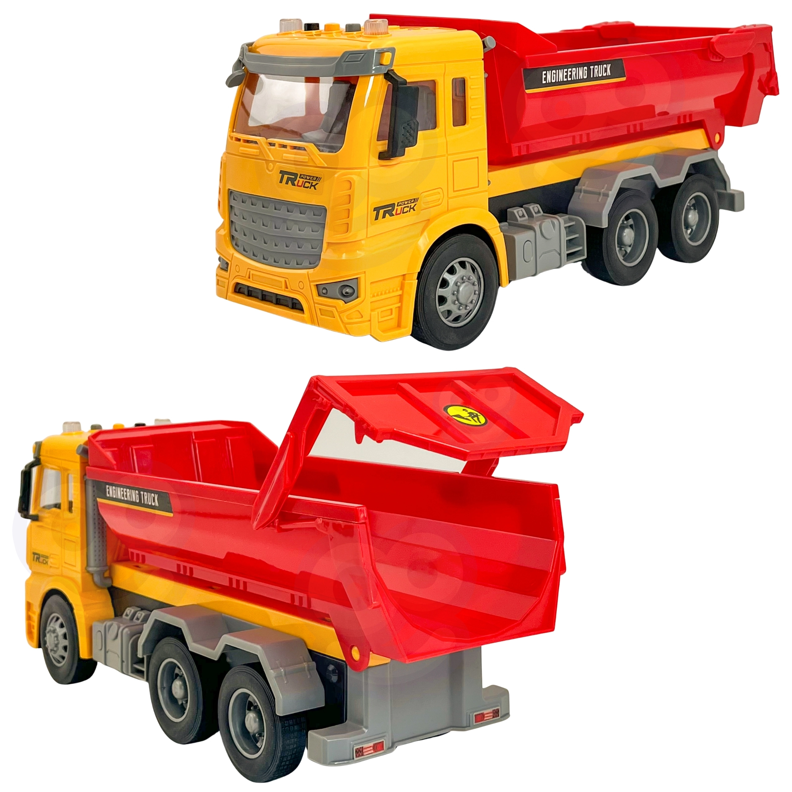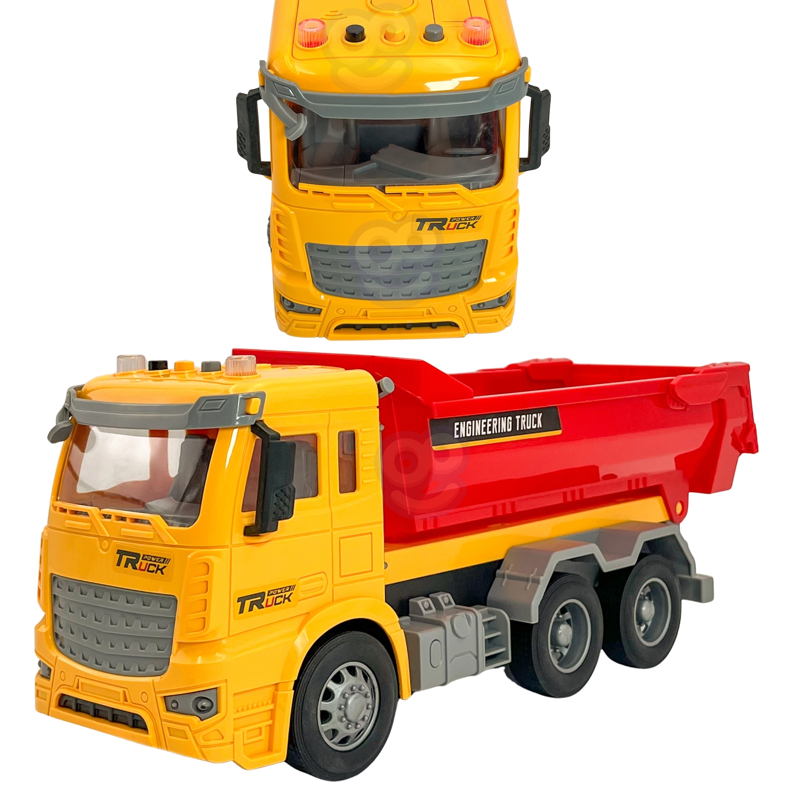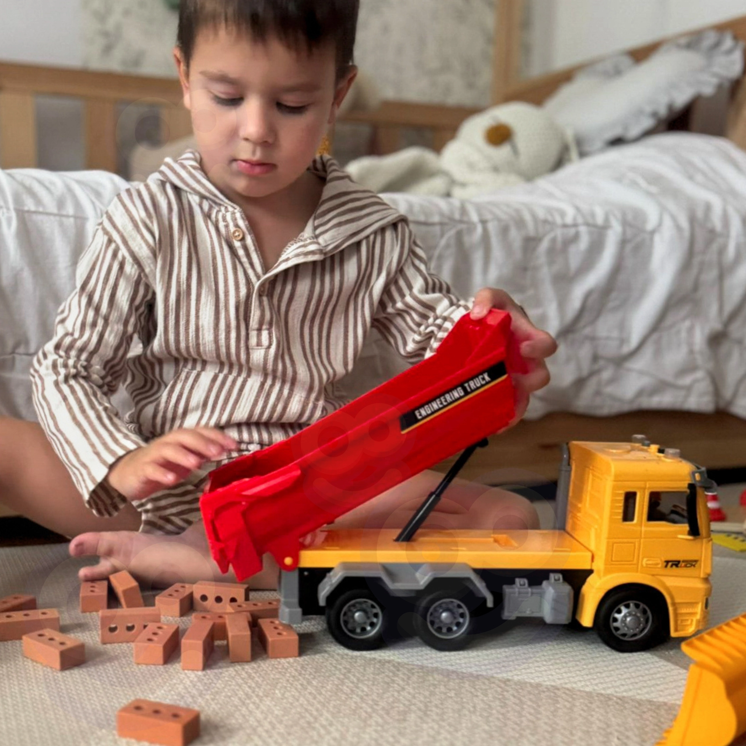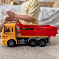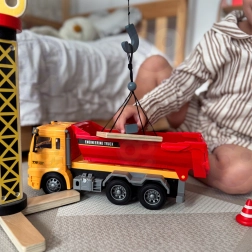 Ta podrobno izdelan otroški prekucnik prinaša avtentično izkušnjo »delovišča« naravnost v otroško sobo. Zahvaljujoč funkcionalnemu nagibnemu kesonu lahko otroci nakladajo, prevažajo in razsipavajo kocke ali druge drobnarije, medtem ko luči na strehi kabine in realistični zvoki podpirajo igro vlog malih inženirjev in gradbincev.