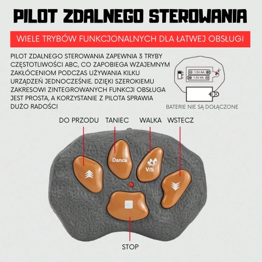 - Za delovanje dinozavra in upravljalnika je potrebnih 5 x 1.5V AA baterij (niso priložene).