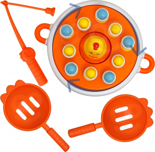Magnetna palica olajša lovljenje, večji snemljivi piščanček pa služi kot zabavno vozilce za dodatne igralne scenarije.