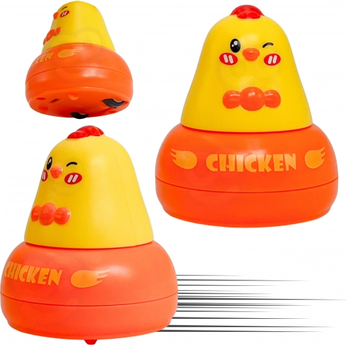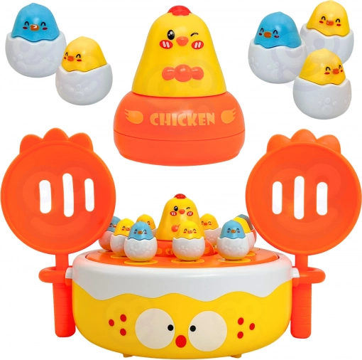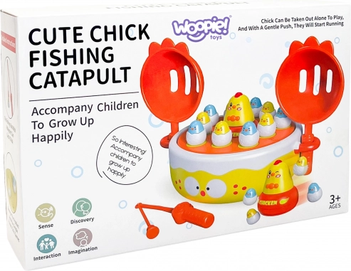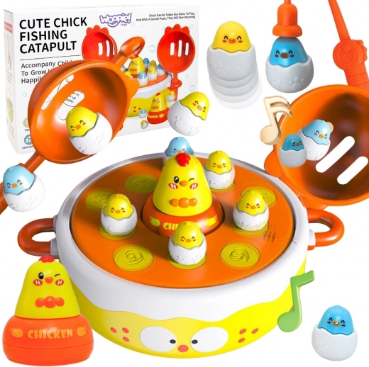 Ta vsestranska igrača združuje kar štiri igre v enem setu, zato zabava ne bo tako hitro pošla. Vrteča se osnova z glasbo naključno dviguje piščančke, ki jih je možno loviti z magnetno palico ali ujeti z lopatkami po izstrelitvi iz katapulta. Večji snemljivi piščanček služi kot igrivo vozilce.