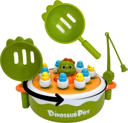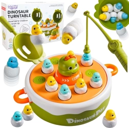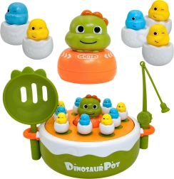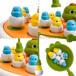 Odpravite se z otroki v pradavnino z interaktivno igro znamke WOOPIE. Ta vsestranski set 4v1 združuje magnetni ribolov, zabavno katapultno igro, mini avto–dino ter na hrbtni strani osnove tudi križci in krožci. Pisane figurice dino-piščkov v “lupinicah” in spretno rokovanje s palicami ter lopatkami razvijajo fino motoriko, koordinacijske veščine in skupno igro v dvoje.