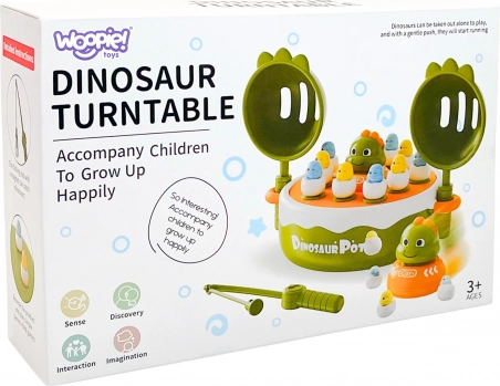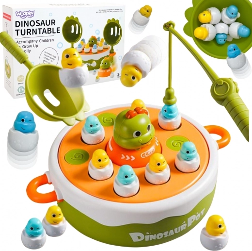 - Obojestranska vrtljiva platforma z ročaji, figurice dino v “jajčkih”, 1× magnetna ribiška palica, 2× lopatka, dino–avto, darilna embalaža