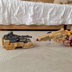 Vsebina paketa: 1× transformacijski robot/tank, 1× pištola (revolver), 3× penasta puščica, dodatna bojna oprema.