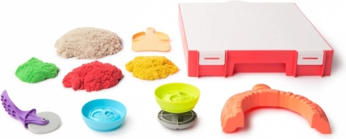- 450 g kinetičnega peska v 4 barvah, 2 stiskalnici, 3 orodja, škatla/igralna površina
