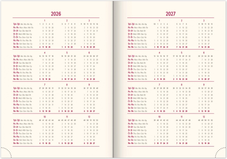 Tedenski dnevnik Essenza 2026 v slivovi barvi je idealna izbira za tiste, ki iščejo stilsko in trajnostno orodje za načrtovanje. Odlikujeta ga ekološka platnica in večjezični koledar.