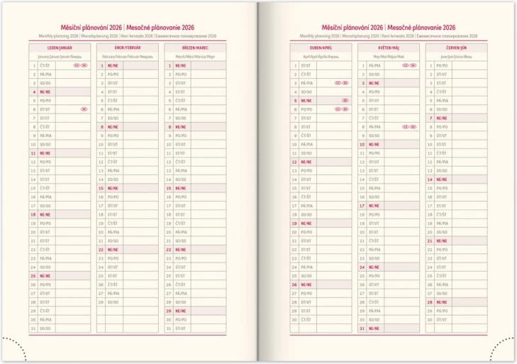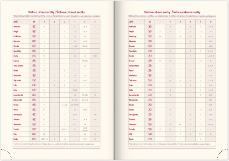 Slogoven in cenovno dostopen tedenski dnevnik Essenza iz ekološkega papirja združuje praktičnost in trajnost. Ponuja češko-slovaški koledar z dopolnilnim angleškim, nemškim, madžarskim in ruskim jezikom.