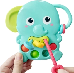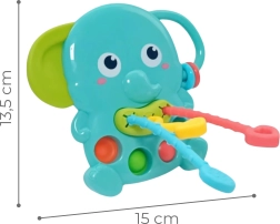Igrača združuje senzorično stimulacijo z olajšanjem pri izraščanju zob. Raznolike teksture in drsni gumbi razvijajo logično razmišljanje in natančnost gibov, medtem ko gibljivi obročki na rilcu vključujejo vid in sluh. Prijazen videz slona motivira otroke k samostojnemu raziskovanju in veseli igri.