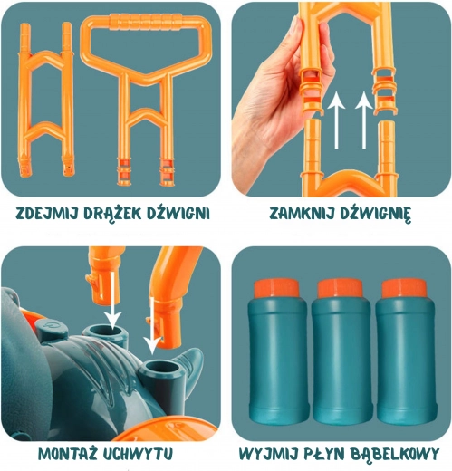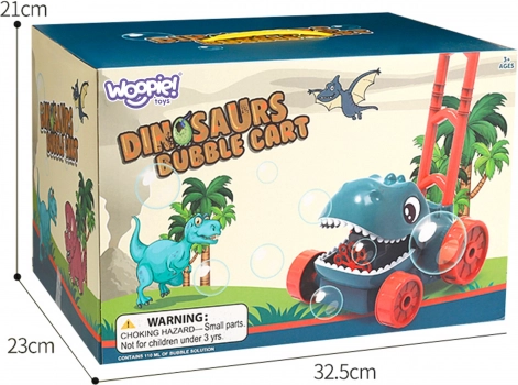 Pri potiskanju se sproži mehanizem, ki iz dinozavrovih ust sprošča stotine mehurčkov – takojšnje veselje in neskončna zabava na prostem.