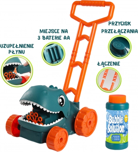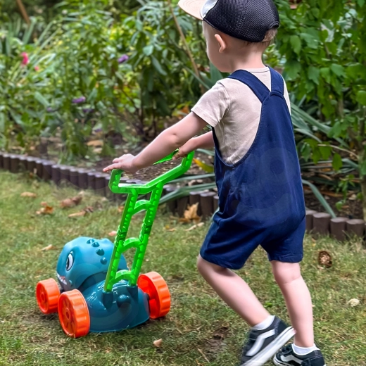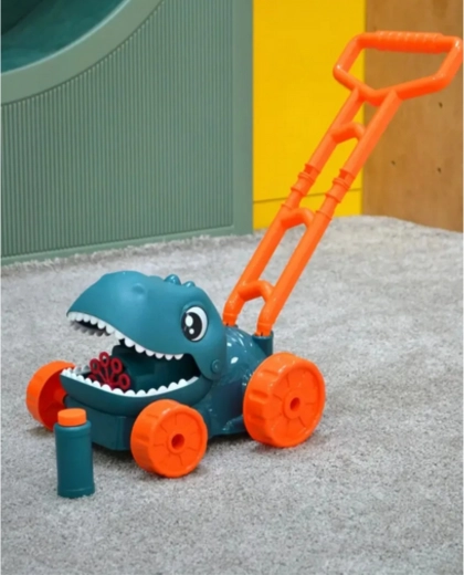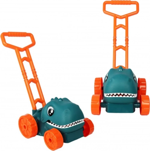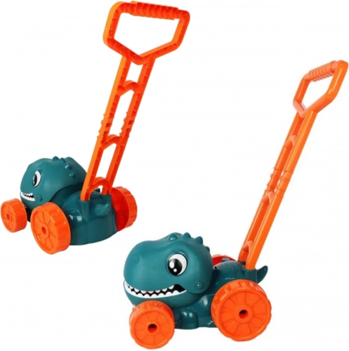 Ta barvita dinozavrska kosilnica otroke vabi k gibanju – dovolj je, da v posodico nalijete raztopino, vklopite in ob potiskanju se zavrti mehanizem za mehurčke, ki sprošča pravo poplavo mehurčkov. Mehke linije, prijazen izraz in stabilna kolesa podpirajo varno in veselo igro na vrtu ali pločniku.