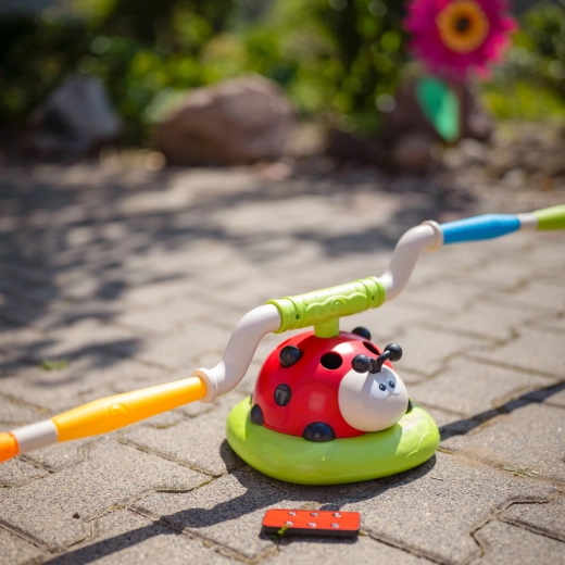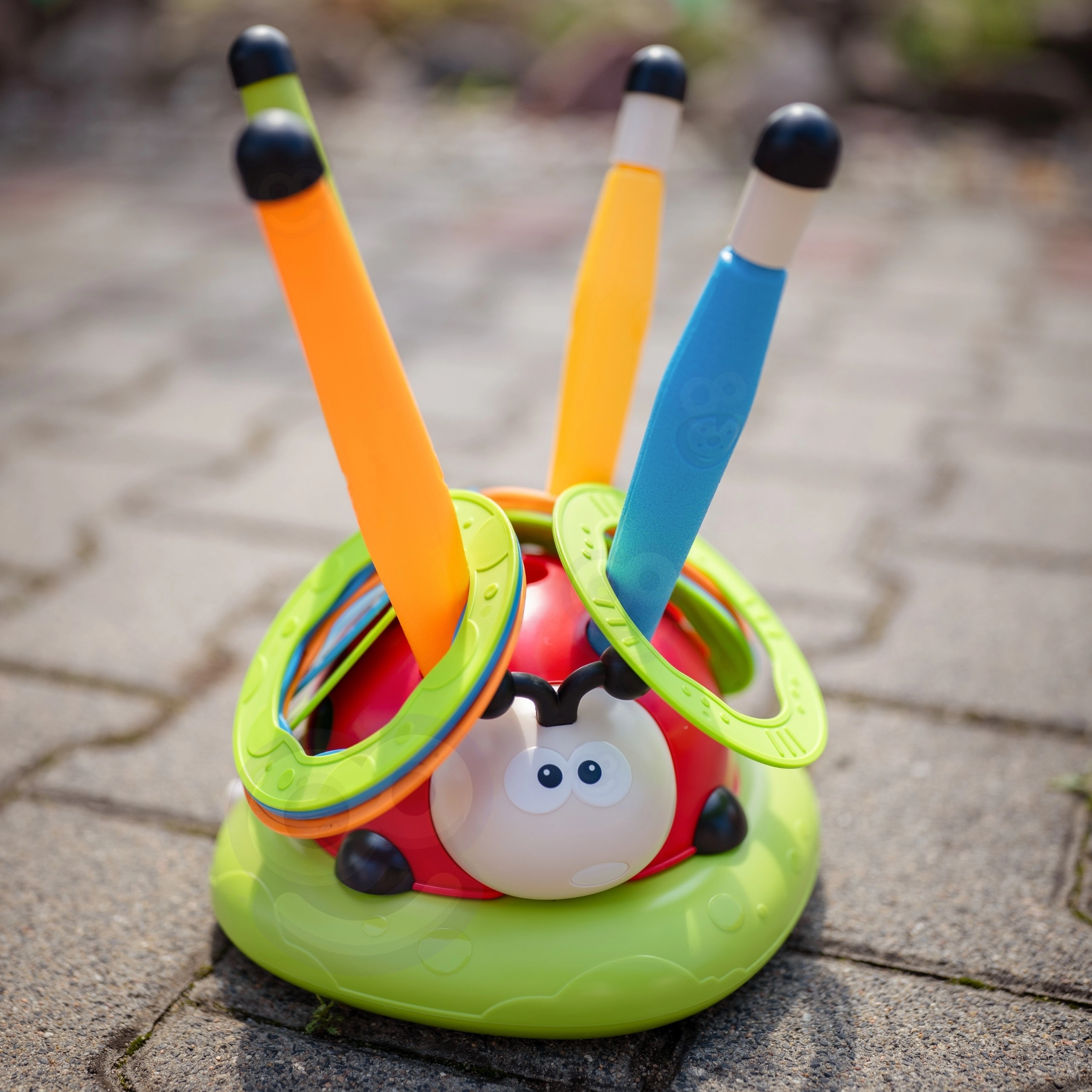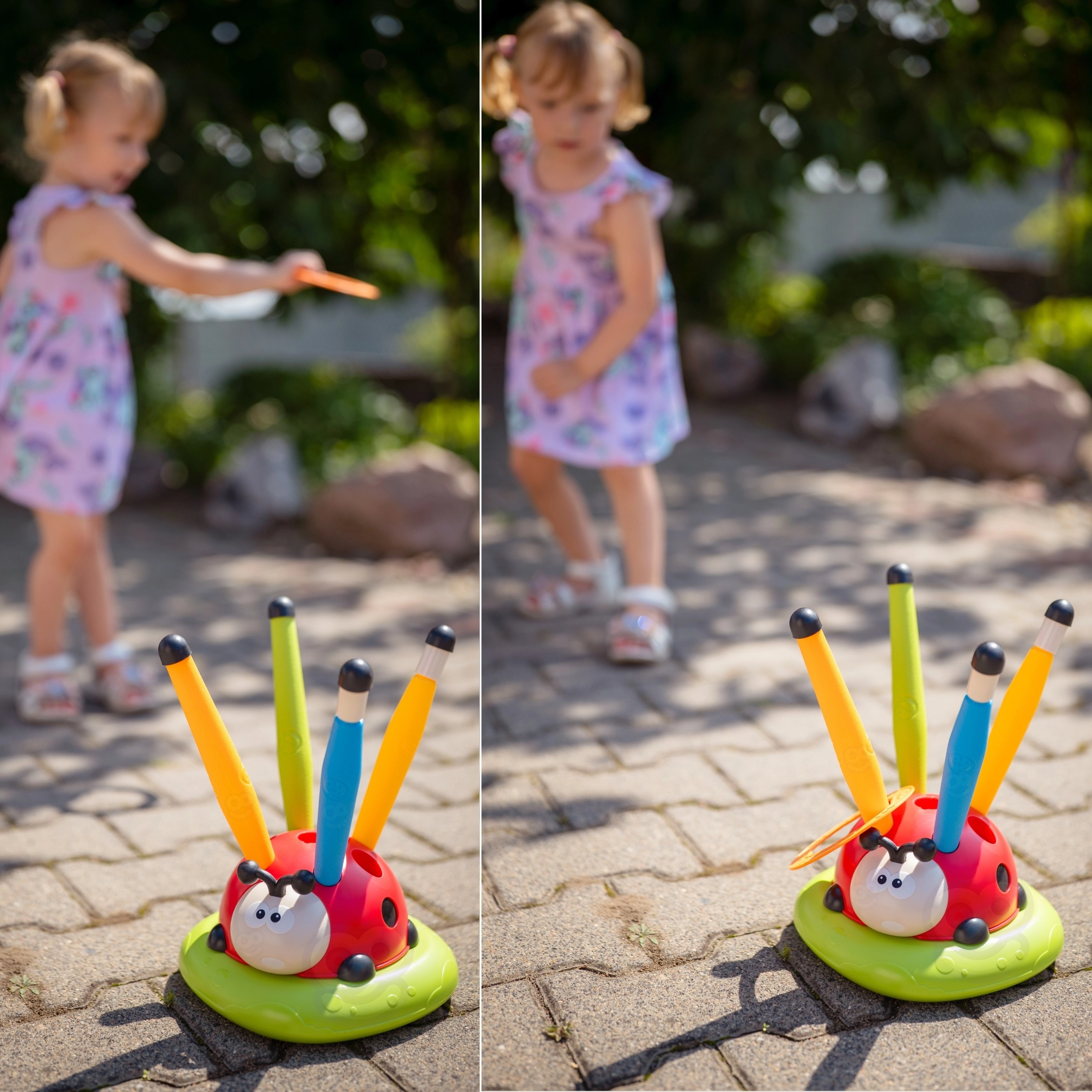 Barvni obroči ciljajo na količke v bazi pikapolonice. Aktivna igra razvija fino motoriko, potrpežljivost in tekmovalnost otrok.