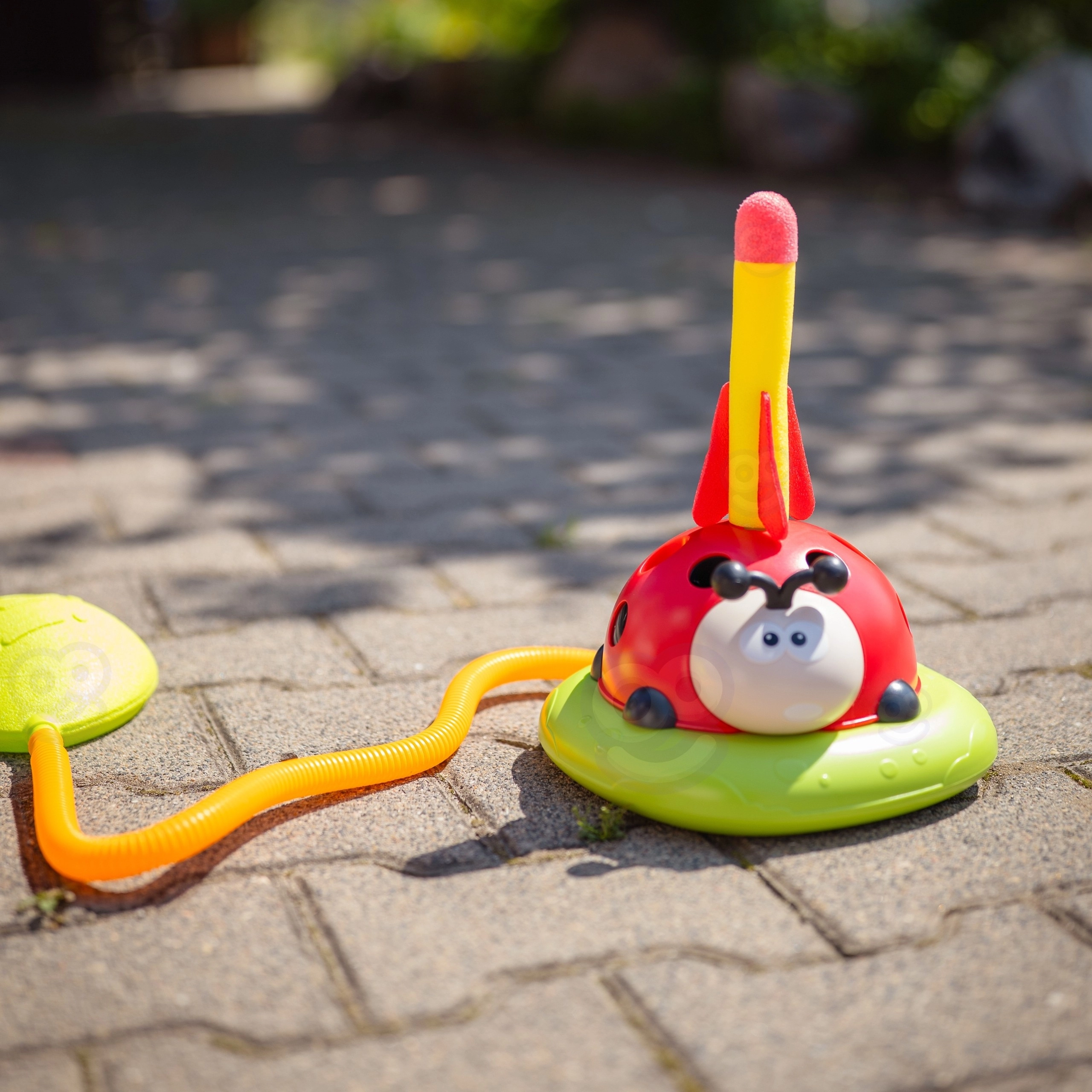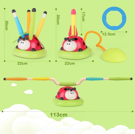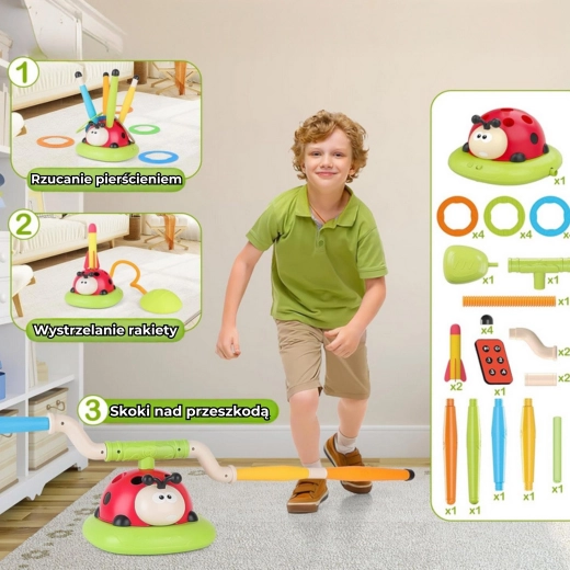 Idealno za zabave, piknike in družinska popoldneva. Napajanje interaktivnih funkcij: 4× AA (niso priložene). V paketu najdete pikapolonico, 12 barvnih obročev, raketo s črpalko, elemente skakalne palice in daljinski upravljalnik.