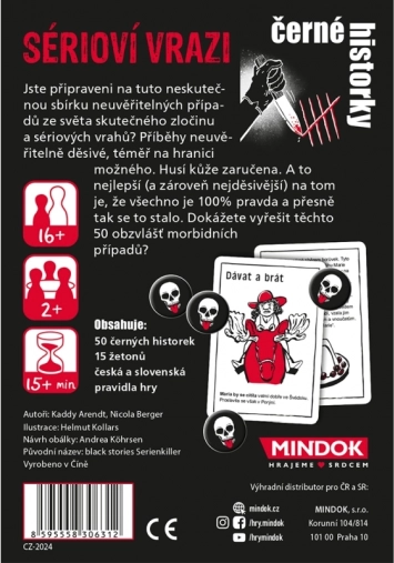 Potopite se v svet resničnega zločina z izdajo Črne zgodbe: Serijski morilci – paketom 50 srhljivih primerov, navdihnjenih z resničnimi dogodki. Igralci skupaj razkrivajo grozljive skrivnosti z zastavljanjem premišljenih vprašanj in korak za korakom rekonstruirajo, kaj se je v resnici zgodilo. Idealno za zabave, dolge večere ter ljubitelje detektivk in true crime zgodb.