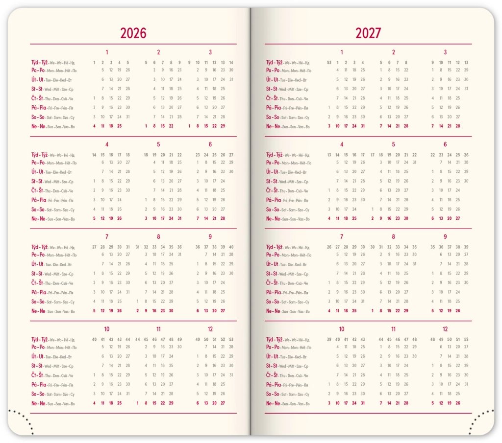 Odkrijte novo serijo dnevnikov Essenza, ki ni le cenovno dostopna, temveč tudi prijazna do okolja zahvaljujoč platnici iz ekološkega papirja. Ta dnevnik ponuja tedenski razpored s češko-slovaškim koledarjem z dodatnimi jeziki, vključno z angleščino, nemščino, madžarščino in ruščino.