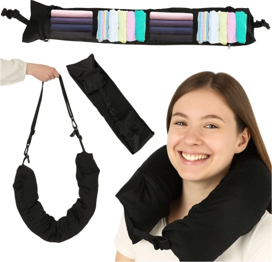 Ta potovalna blazina je idealni sopotnik na poti. Opremljena je z sprednjim zapenjanjem v obliki sponke, kar zagotavlja stabilnost in udobje med uporabo. Notranji velik žep zagotavlja praktično shranjevanje za vaše osebne stvari. Dve stranski zadrgi omogočata enostaven dostop z obeh strani, pri čemer se levi in desni žepi združujejo znotraj.