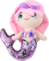 Doživite čarobnost s to morsko deklico, ki ima velike vezenine oči in nasmejan obraz. Rožnati lasje s pentljo in impresiven rep, pokrit z dvobarvnimi bleščečimi deli, ustvarjajo edinstven videz. Bleščeči deli spreminjajo barvo iz vijolične v srebrno ob dotiku, kar spodbuja otroško domišljijo in čut dotika.