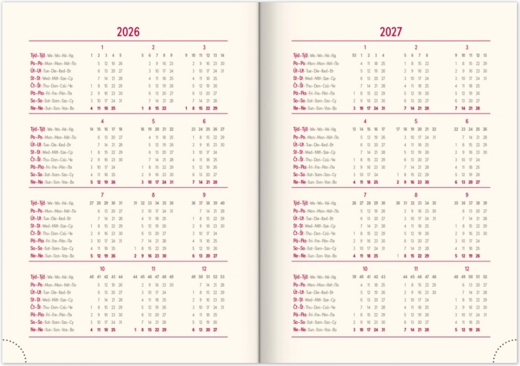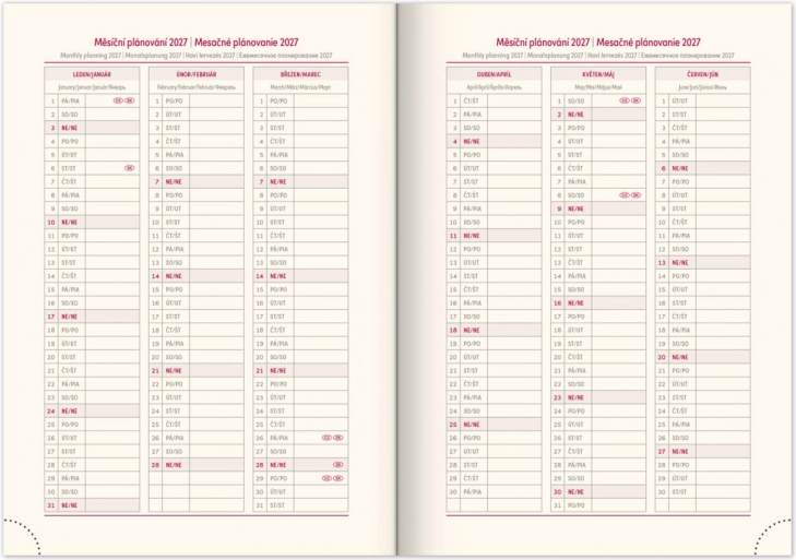 - Razpored za vsak dan s češko-slovaškim koledarjem in dodatnimi jezikovnimi različicami v angleščini, nemščini, madžarščini in ruščini.