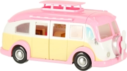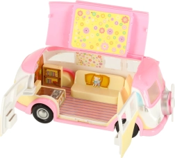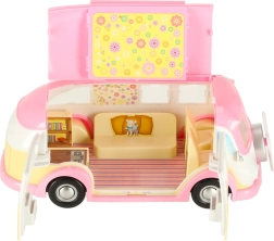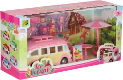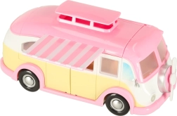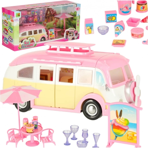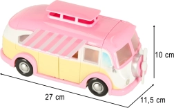 Ta simpatičen sladoledni kamper v rožnato-kremnih barvah spremeni vsak prostor v malo bistro na kolesih. Otroci lahko odprejo streho in vrata, izvlečejo markizo ter postrežejo stranke pri mizici s senčnikom. Realistični detajli notranjosti spodbujajo ustvarjalne zgodbe in dolge ure igre.