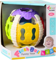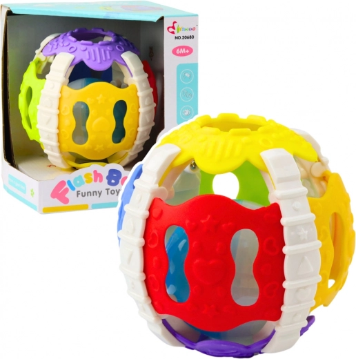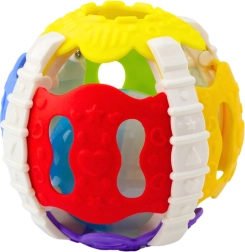Znotraj žogice je plastična kroglica, ki ob gibanju ustvarja nežne zvoke in barvne lučke, kar učinkovito pritegne otrokovo pozornost. Interaktivni svetlobni in zvočni učinki ne le zabavajo, temveč tudi podpirajo razvoj gibalno-koordnacijskih sposobnosti in otrokovega zaznavanja.