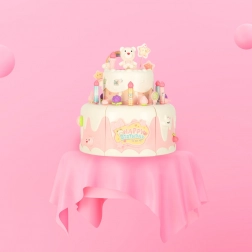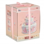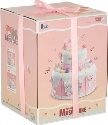 Torta je okrašena z rožnatim trakom in zapakirana v pregledni embalaži z okencem. Napajanje z zagotavljajo tremi baterijami AA (niso priložene).