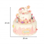 Dvonadstropna rojstnodnevna torta iz kakovostne plastike je idealna igrača za otroke starejše od 3 let. Spodbuja otrokovo ustvarjalnost in fino motoriko zahvaljujoč interaktivnim elementom, kot sta vrtenje in zvočni učinki. V kompletu sta prisrčni figurici medvedka in samoroga, šest svečk ter dodatni pripomočki.