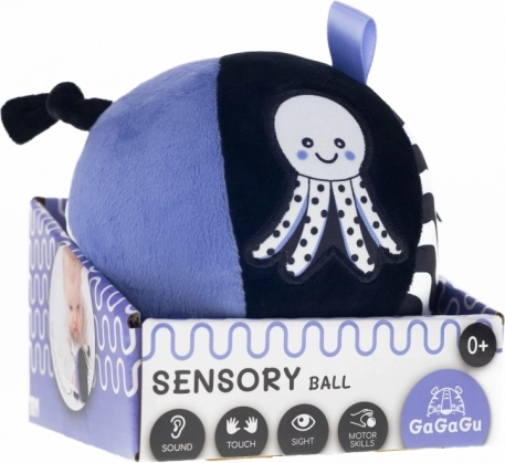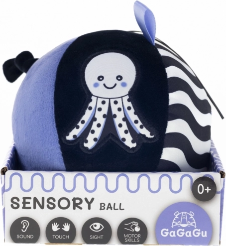 Prikupen motiv hobotnice, trakovi in zanka za lahek oprijem spodbujajo interaktivno igro. Raziskovanje oblik, barv in zvokov razvija kognitivne veščine, zbranost in radovednost. Žogica je primerna za dečke in deklice od 0+ in je odlična za voziček, posteljico ali igralni kotiček.