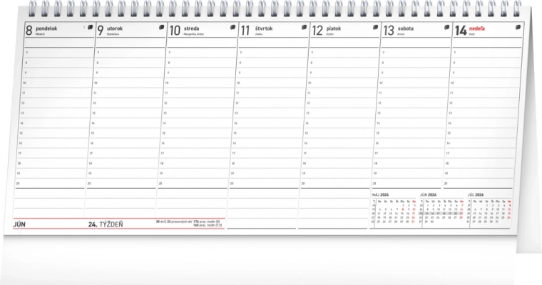 Namizni koledar za managerje s stolpčnim koledarjem, ki vsebuje vse davčne roke, slovaška imena, praznike in spominske dni ter trimesečni pregled za vsak teden.