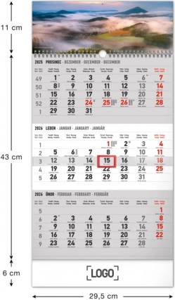 Trimesečni stenski koledar z motivom krajine v elegantni sivi izvedbi prinaša jasen pregled nad preteklim, trenutnim in prihajajočim mesecem. Z drsnim označevalnikom zlahka poudarite trenutni datum, z letnim pregledom pa boste imeli pomembne termine pod nadzorom.
