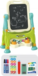 Izobraževalna dvostranska tabla je opremljena s funkcijo vrtenja za 360°, kar omogoča hitro spremembo delovne površine brez razstavljanja. Njena višina je prilagojena potrebam otrok, stabilnost pa zagotavlja trdno stojalo s široko osnovo. Praktična polica z barvnimi posodicami pomaga ohranjati red med risarskimi pripomočki.