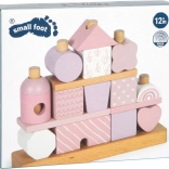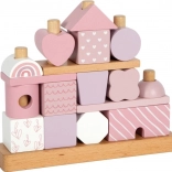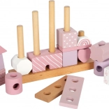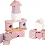 Ta čudovita hišica z lesenimi kosi bo razveselila vsakega malega graditelja. Nežni pastelni odtenki skupaj z naravnimi elementi prispevajo k estetiki, raznolikost oblik in vzorcev pa omogoča neskončne možnosti igre. Zaradi zaobljenih robov je primerna tudi za najmlajše otroke ter prispeva k razvoju njihove fine motorike in koordinacije roka-oko.