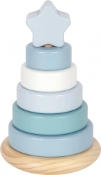 Odkrijte čar zlaganja s tem lesenim stolpom znamke Small Foot. V nežnih pastelnih odtenkih modre in naravnega lesa prinaša ne le zabavo, temveč tudi učenje. Otroci vadijo tako motoriko kot zaznavanje velikosti.