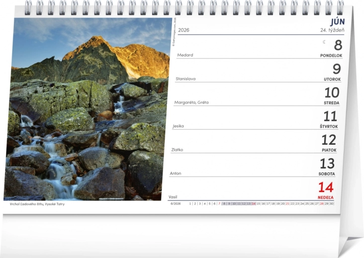 Odkrijte čudovite razglede slovaške pokrajine z namiznim koledarjem za leto 2026, ki vsebuje tedenski koledar z imeni, prazniki in spominskimi dnevi v slovaščini.