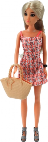 Deklica nosi rdečo obleko z geometrijskim vzorcem in sive sandale s polno peto. Njene dolge blond lase je mogoče česati in oblikovati. Stil dopolnjujeta slamnik in slamnata torbica – idealno za sončne dni. Deček je oblečen v črno brezrokavno majico s potiskom, bele hlače in rjave čevlje, kar ustvarja modni poletni videz.