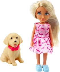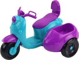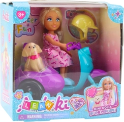 Punčka vozi trikolesni skuter v intenzivni turkizno-vijolični barvi. Prikolica ob strani skuterja skriva majhnega psa z rdečo ovratnico – zvestega spremljevalca na vsaki poti. Set je izdelan iz trpežne, varne plastike, idealne za vsakodnevno igro.