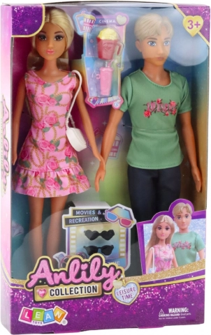Komplet Anlily Dekle z Dečkom je odlična izbira za otroke, ki radi uprizarjajo vsakdanje situacije. Vsebuje dve lutki – dečka in dekle – oblečena v eleganten mestni slog. Dekle nosi rožnato obleko s cvetličnim vzorcem in volančkom ter bež sandale, videz dopolnjuje bela mrežasta torbica. Njeni dolgi blond lasje so idealni za oblikovanje, kar omogoča ustvarjanje novih pričesk. Deček je oblečen v zeleno majico s potiskom, ima mornarsko modre hlače in športne čevlje.