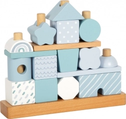 Ta izviren sistem zlaganja omogoča otrokom razporejanje lesenih koščkov na palice, kar ne le podpira koordinacijo in motorične sposobnosti, temveč vključuje tudi njihovo domišljijo. Kocke so skrbno izdelane iz kakovostnega lesa z zaobljenimi robovi, da so varne za majhne otroške ročice. Idealno kot igrača in dekoracija otroške sobice, izdelek je odlična izbira za darilo.