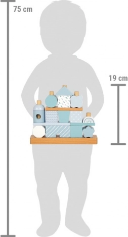 Lesena hiška za zlaganje blagovne znamke Small Foot je zasnovana v nežnih pastelnih odtenkih modre z naravnimi elementi. S skupno 18 različno oblikovanimi in okrašenimi koščki otrokom omogoča razvijanje fine motorike in ustvarjalnosti pri sestavljanju različnih različic hiške.