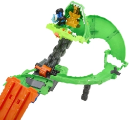 Začni adrenalinski dvoboj v tematskem setu »Morski psi proti dinozavrom: Zmajev dirka«. Vstavi oba tovornjaka v dvojni izstreljevalnik in ju pošlji na vzporedno dirko naravnost v gobec kibernetskega zmaja. O vsem odloča preklop v obliki žage, ki naključno določi, ali se vozila ustavijo, eno pade s proge ali oba poletita skozi in zrušita zmaja.