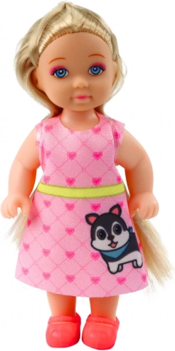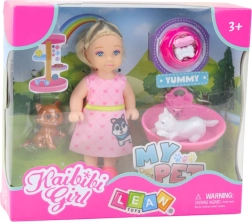 Mini punčka s psom in mačko z dodatki je idealna za male skrbnike. Punčka, visoka 12 cm, oblečena v rožnato obleko z okrasnimi srčki, jo spremljajo plastične figurice živalic. Komplet vsebuje: