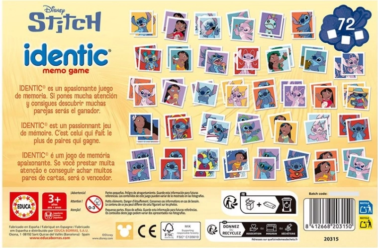 EDUCA Spominske kartice Kovček Stitch so idealne za družinske večere, ko si lahko otroci izboljšujejo spomin in koncentracijo. Igra je sestavljena iz 36 parov, skupaj torej 72 kartic.