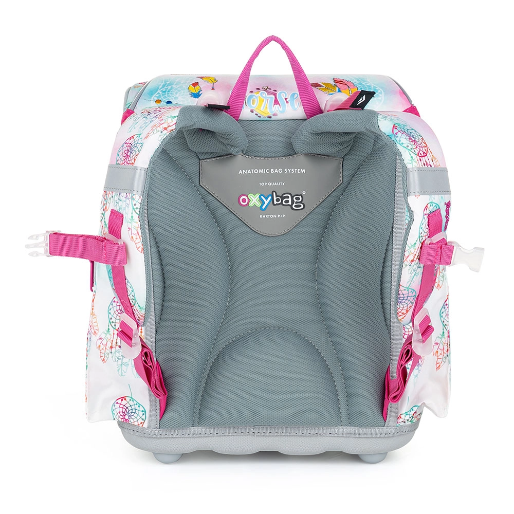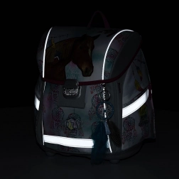 Šolski nahrbtnik iz serije Premium Light z elegantnim motivom konja ponuja več kot le lep videz. Izdelan je iz lahkega materiala, zaradi česar tehta manj kot 900 g. Nahrbtnik je opremljen z udobno zračno podlogo in širokimi oblazinjenimi trakovi, ki enakomerno porazdelijo težo na ramena otroka. Za še večje udobje so tu zatezne in prsne trakove.
