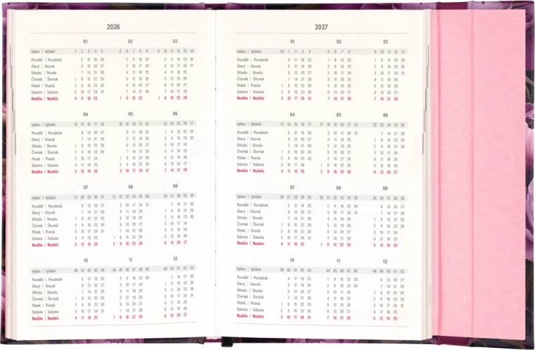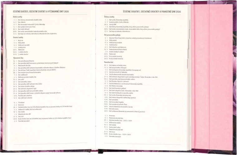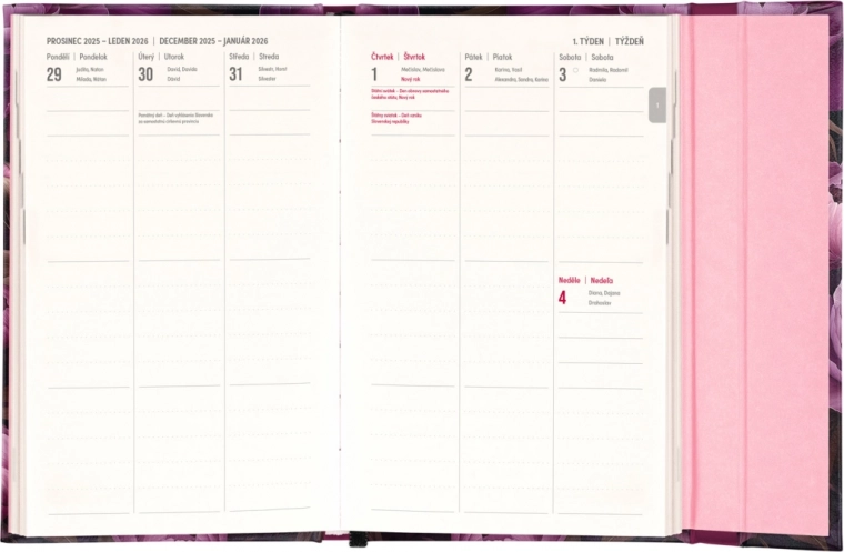 Dnevnik Notique Vijolični cvetovi ni le estetsko prijeten, temveč tudi zelo funkcionalen. Vsebuje mesečne preglede, ki so idealni za načrtovanje dopustov ali počitnic. Poleg tega vključuje seznam čeških in slovaških praznikov ter imen, kar vam pomaga biti vedno pripravljeni.