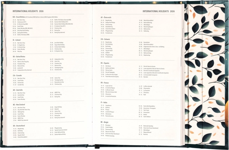 Tedenski dnevnik v angleškem jeziku z mednarodnimi prazniki in praktičnim magnetnim zapiranjem je idealen za vse, ki želijo imeti svoje načrte pregledno pod nadzorom.